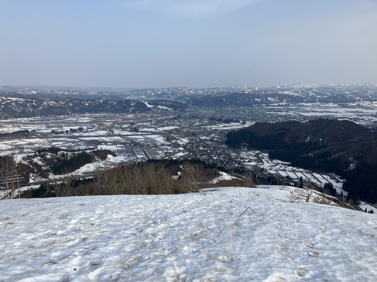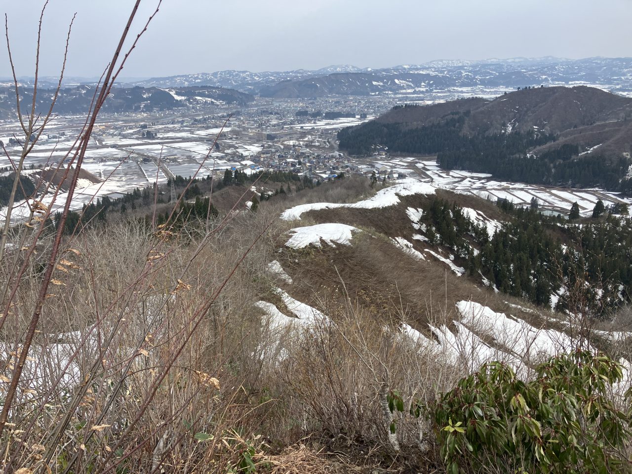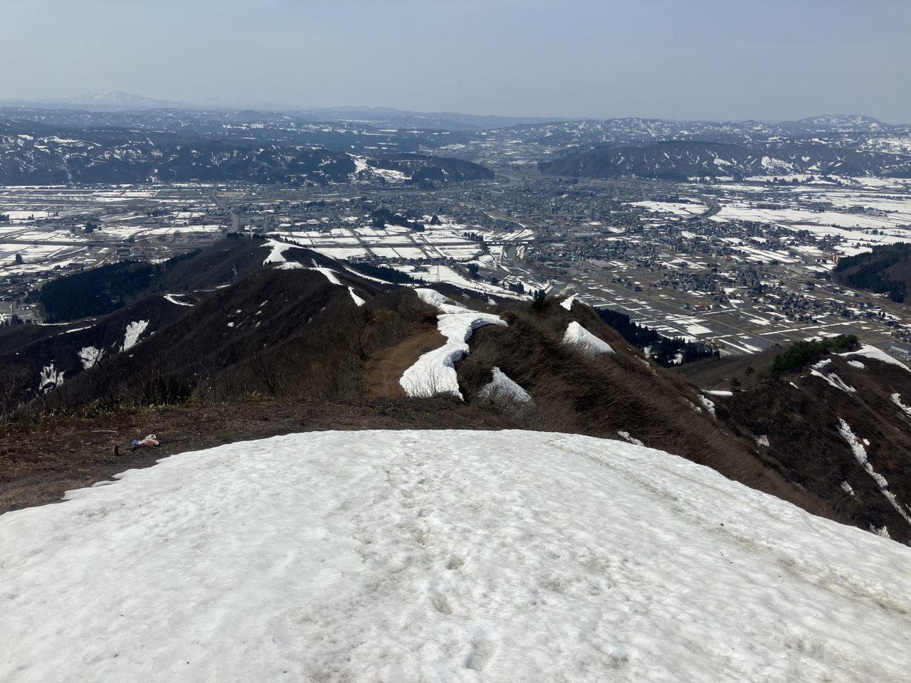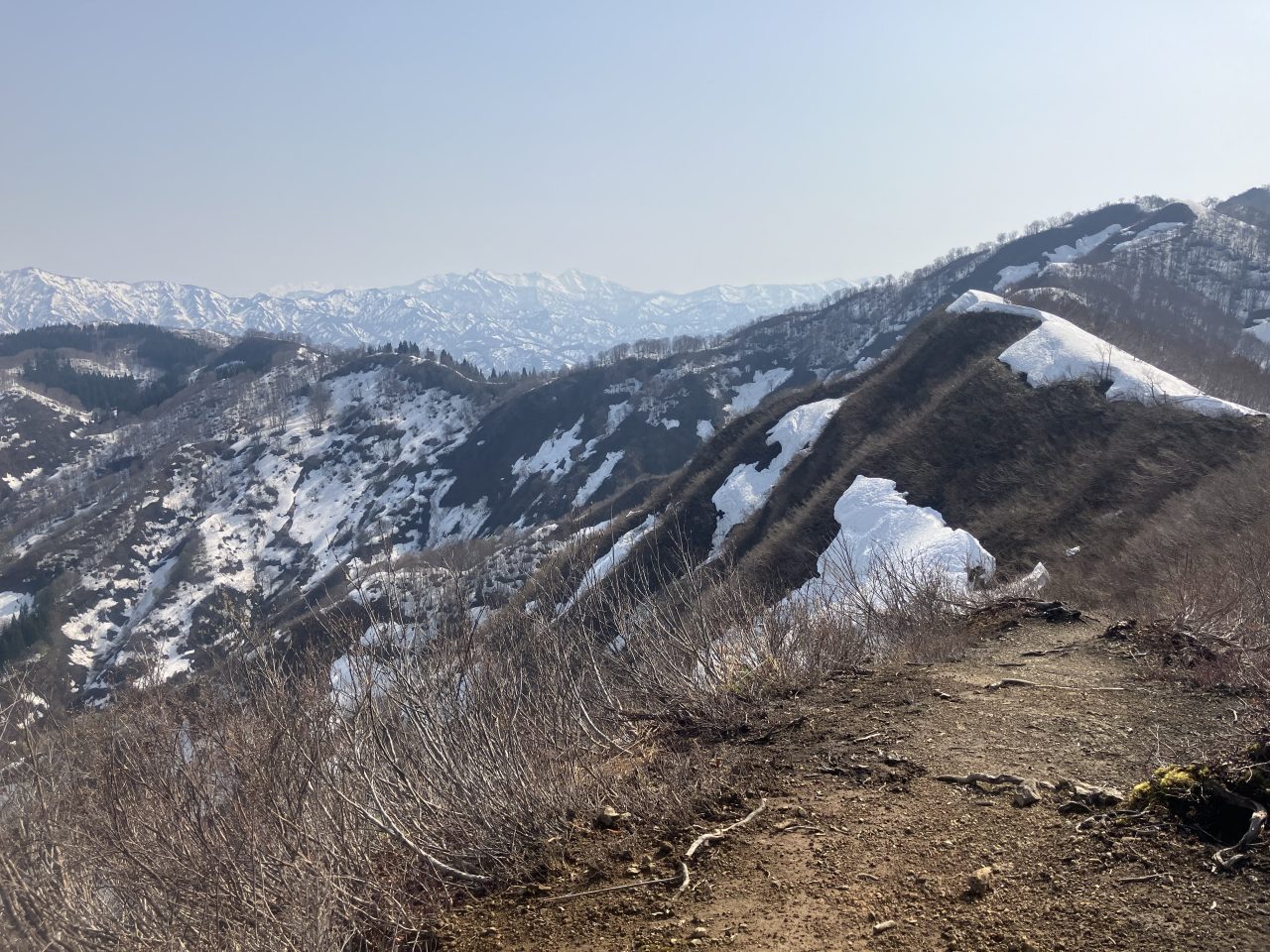 鉄塔を越えると、登山道は薮のやせ尾根になる。振り返ると魚沼の素晴らしい眺望が広がった。