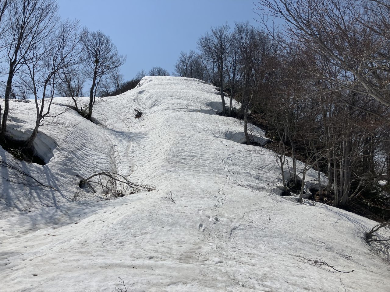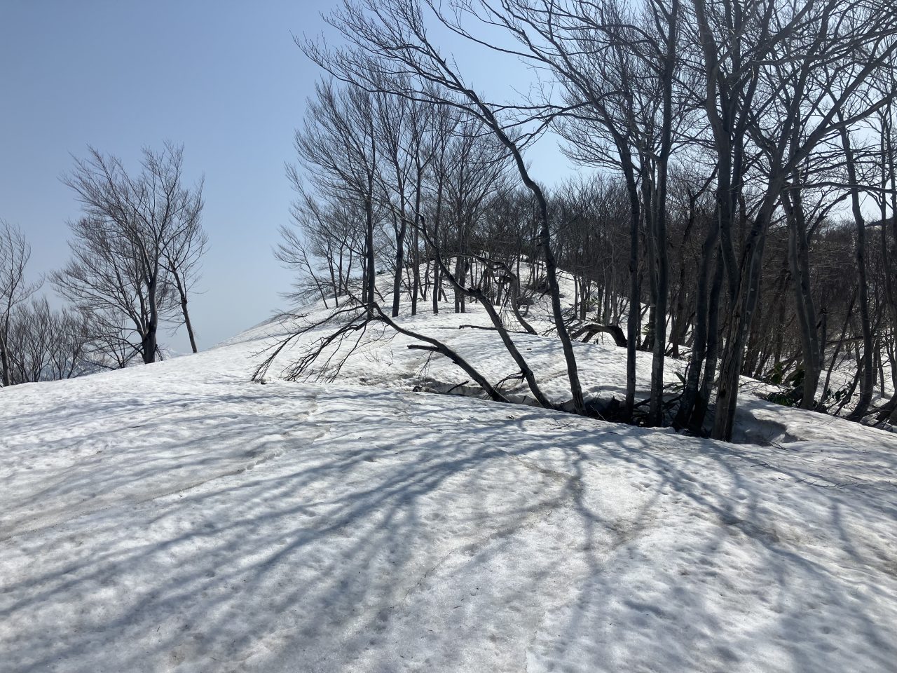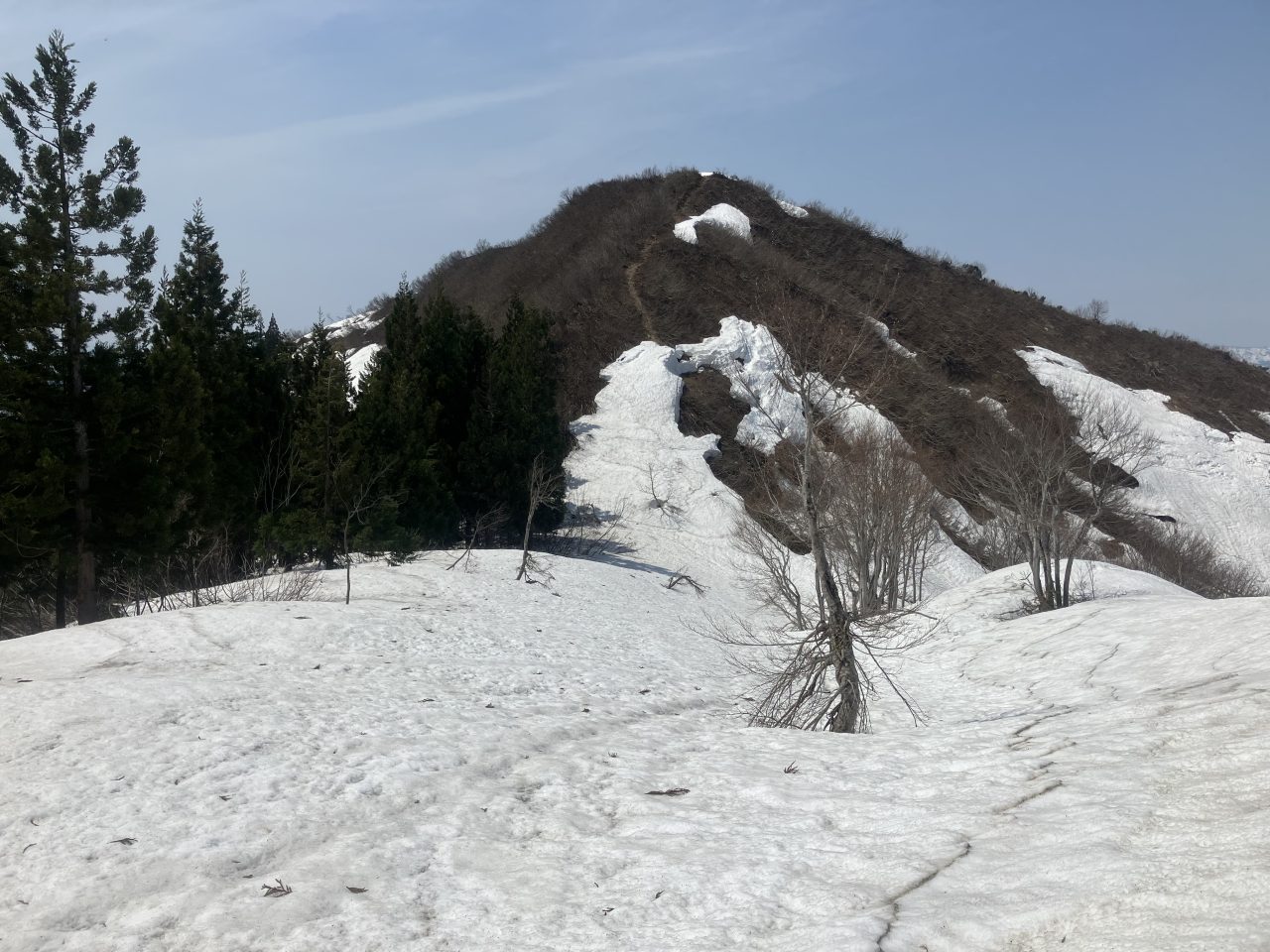 引き続き残雪が多く、楽しい雪山登山だった。鳴倉山の登りも急登でつらい。