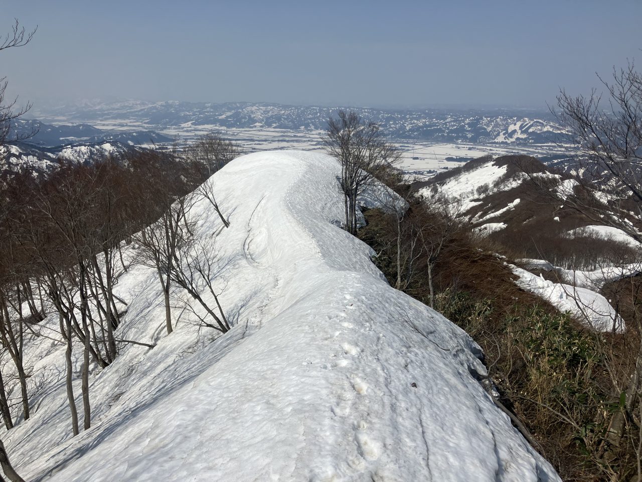 笠倉山へ至る尾根は広くて、雪つきが良い。ブナの気持ち良い森をのんびりと歩く。人もおらず、静かで、町が近い山のはずなのに、秘境感たっぷりの場所だった。テントを持ってきて幕営したい気持ちになった。