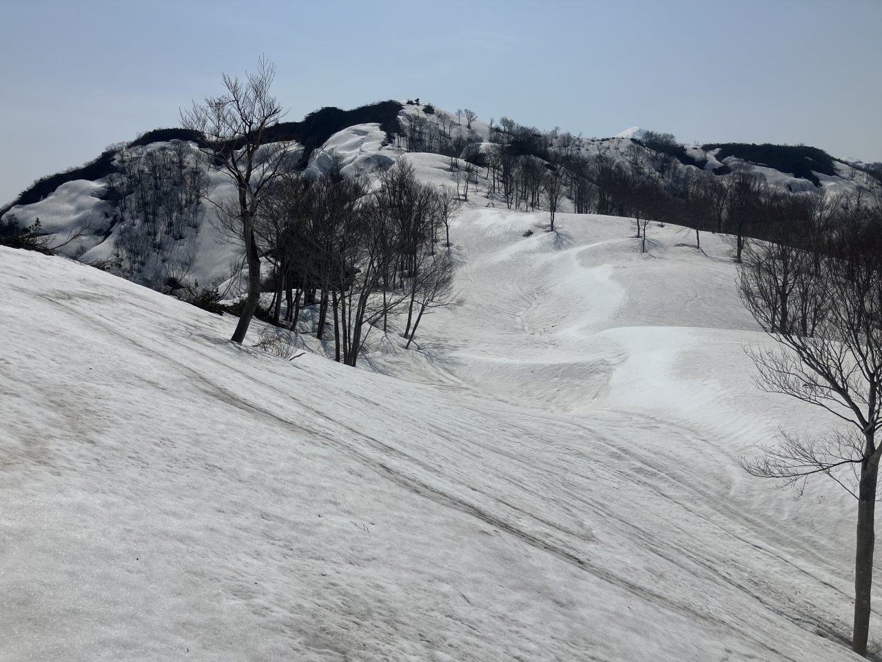 黒禿の頭で小休止し、次は駒の頭を目指す。黒禿の頭からグッと標高を下げる。雪は緩んできて、踵を踏み込みながら軽快に下ることができた。無雪期よりも降りやすいかもしれない。