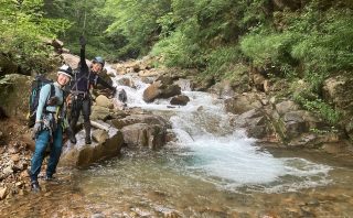 トラバースをしていると、灌木に新しめの残置スリングを発見。我々も先人と同様、50mロープで懸垂下降して沢床に着地。