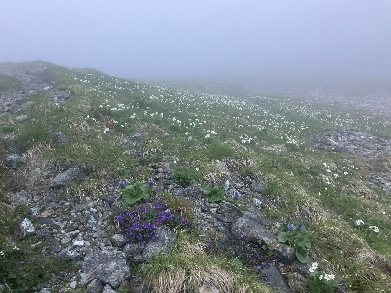 一時はガスに包まれたものの、全体的に天気に恵まれ、展望も素晴らしく、お花もたくさん楽しめた。とても良い山旅だった。