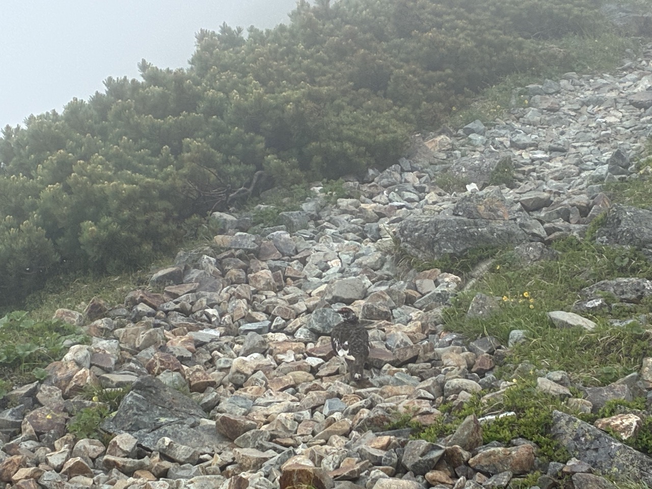 ハイマツの陰から「コロコロ」と蛙のような鳴き声が聞こえてきて、見れば雷鳥が1羽、潜んでいた。