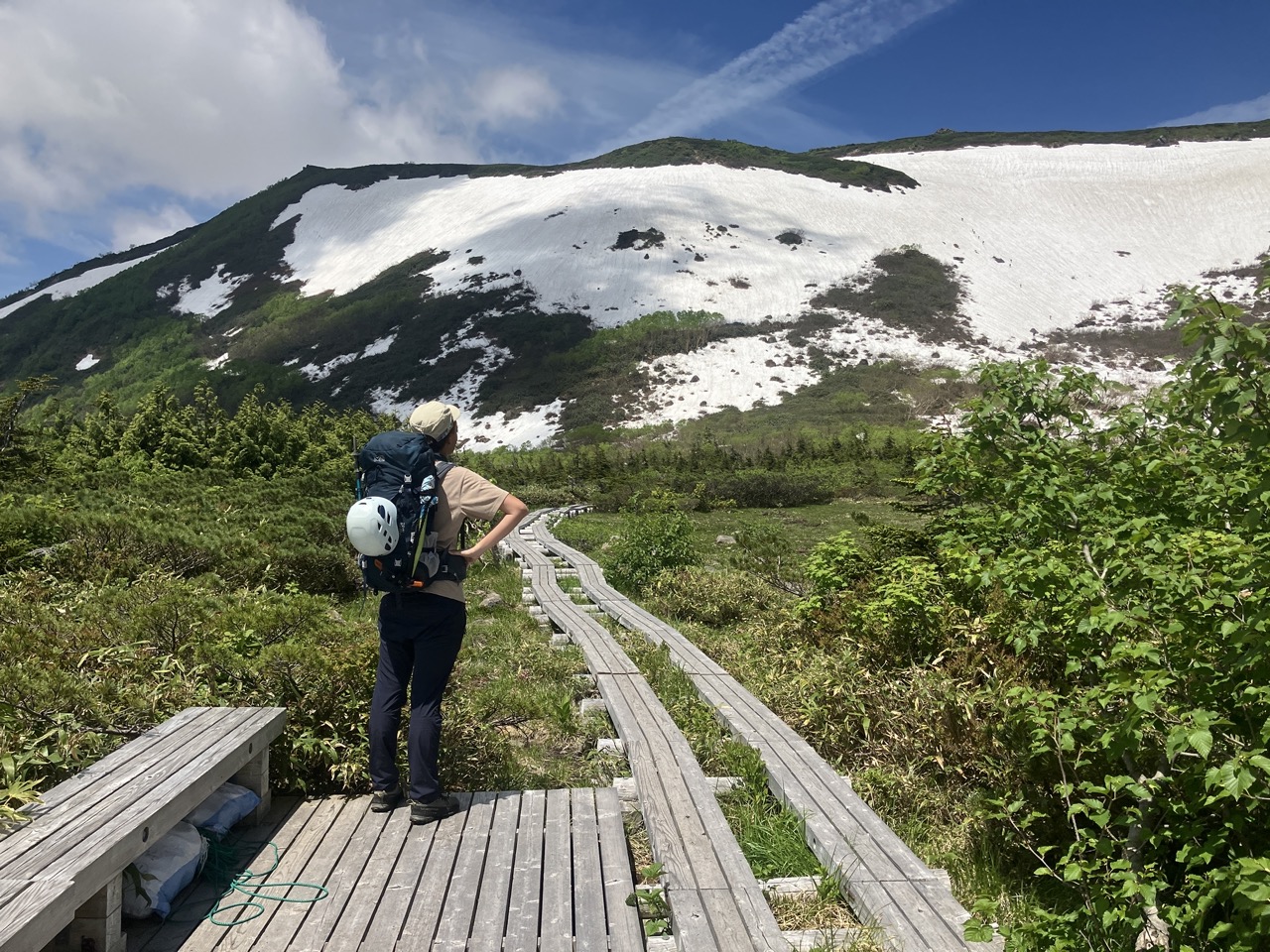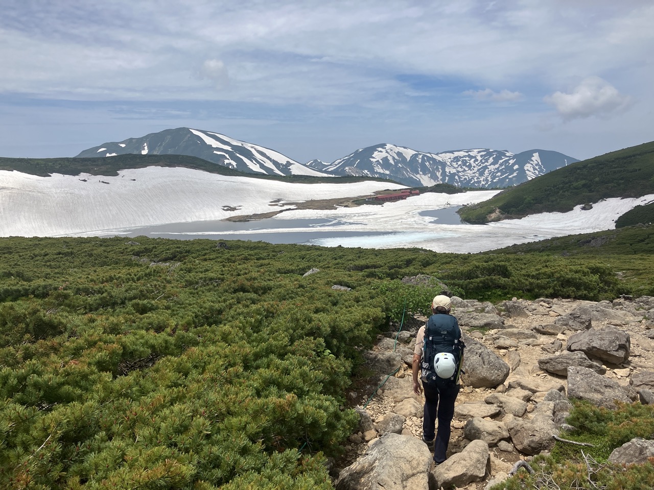 前方右手にはカッコ良い岩壁を携えた「旭岳」が見えた。ちょうど2人パーティーが歩いているのが見えた。私も機会があれば行ってみたい。(今回は行く余裕なし!笑)