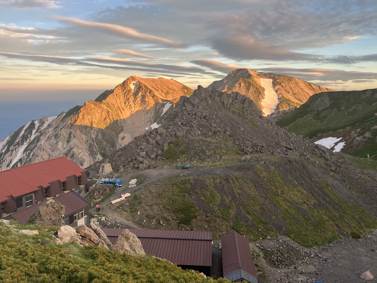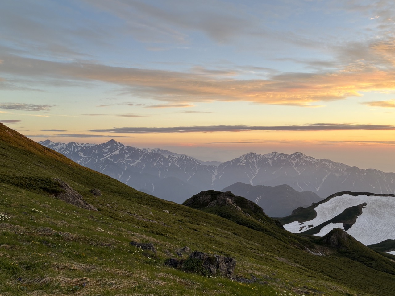 夕暮れ時になり日没を眺めに稜線へ。明日歩く杓子岳が赤く染まる。遠くには剱岳も見えた。剱もまた行きたいなぁ。
