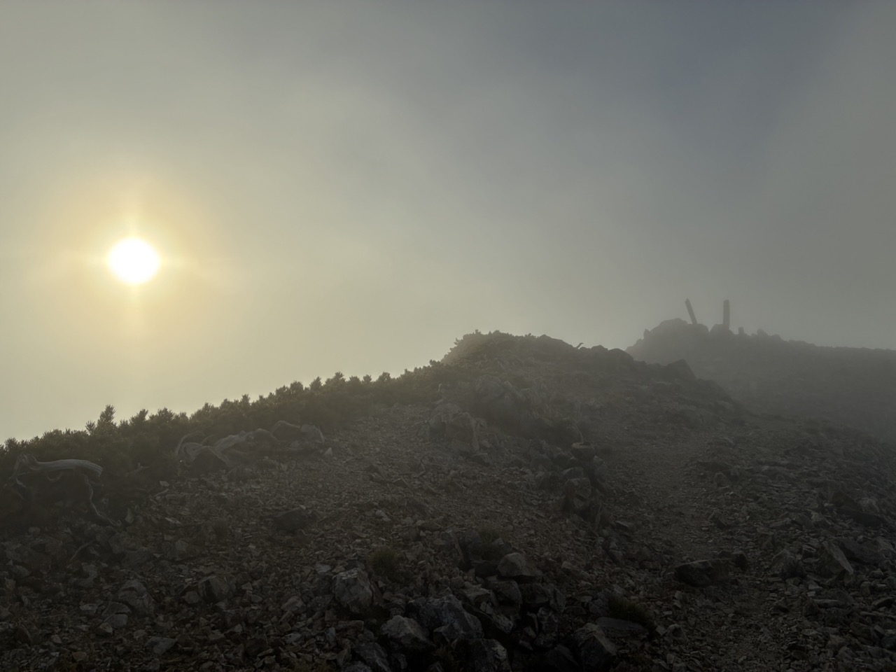 白馬鑓ヶ岳に着く頃には日も昇って明るくなってきた。でも相変わらずガスガス。