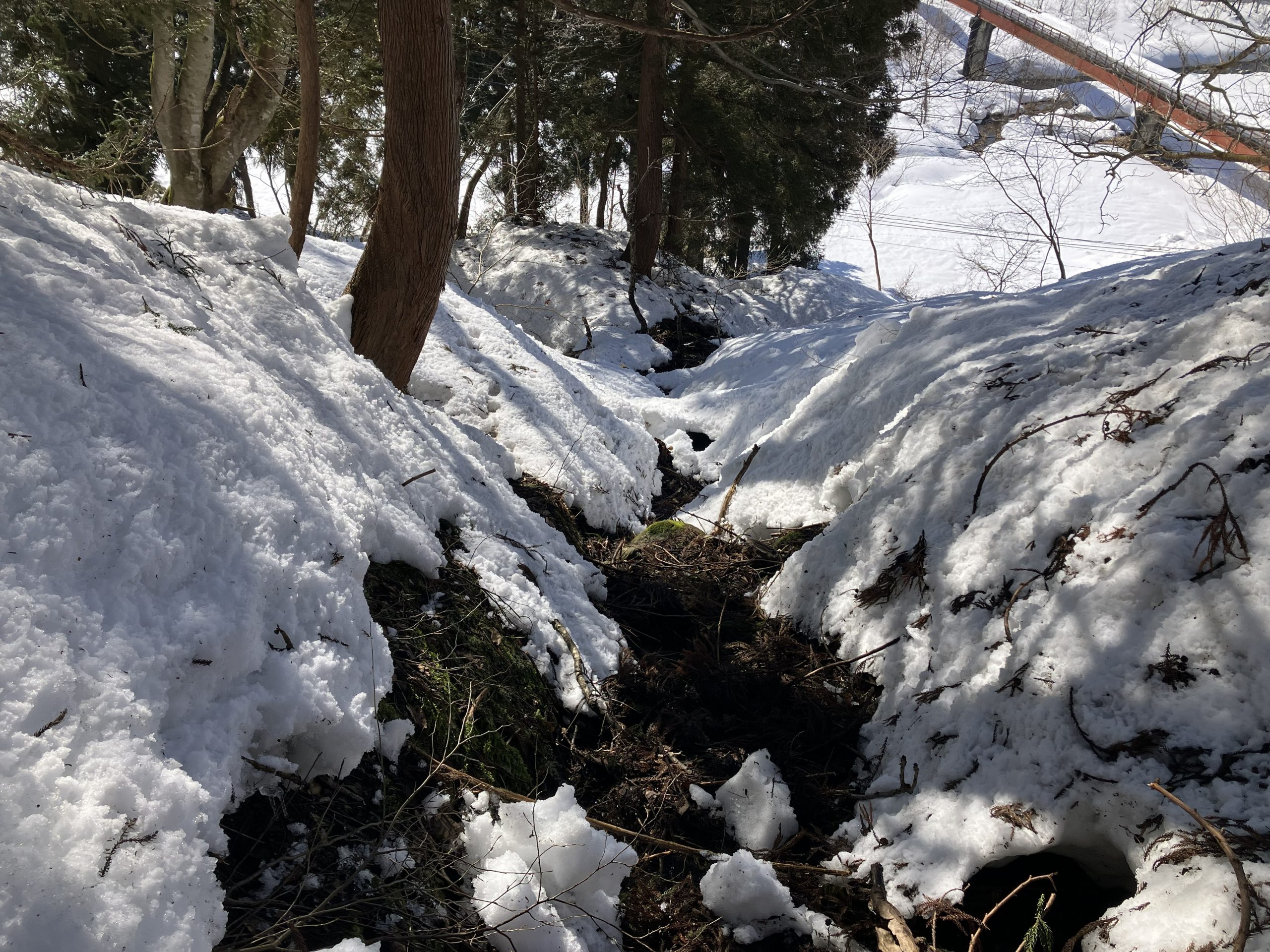 と、さなしが先に進み始めるが、雪の段差が上がれなくてジャンプした勢いで大岩の裏に1mほど落ちてしまった。