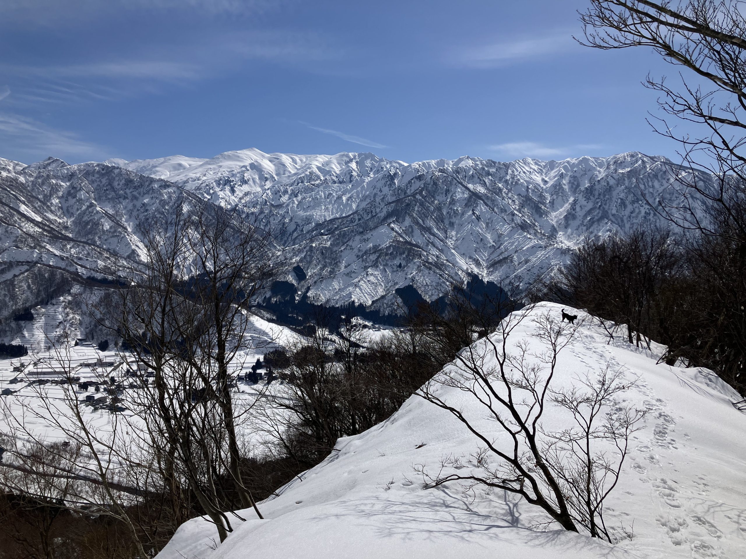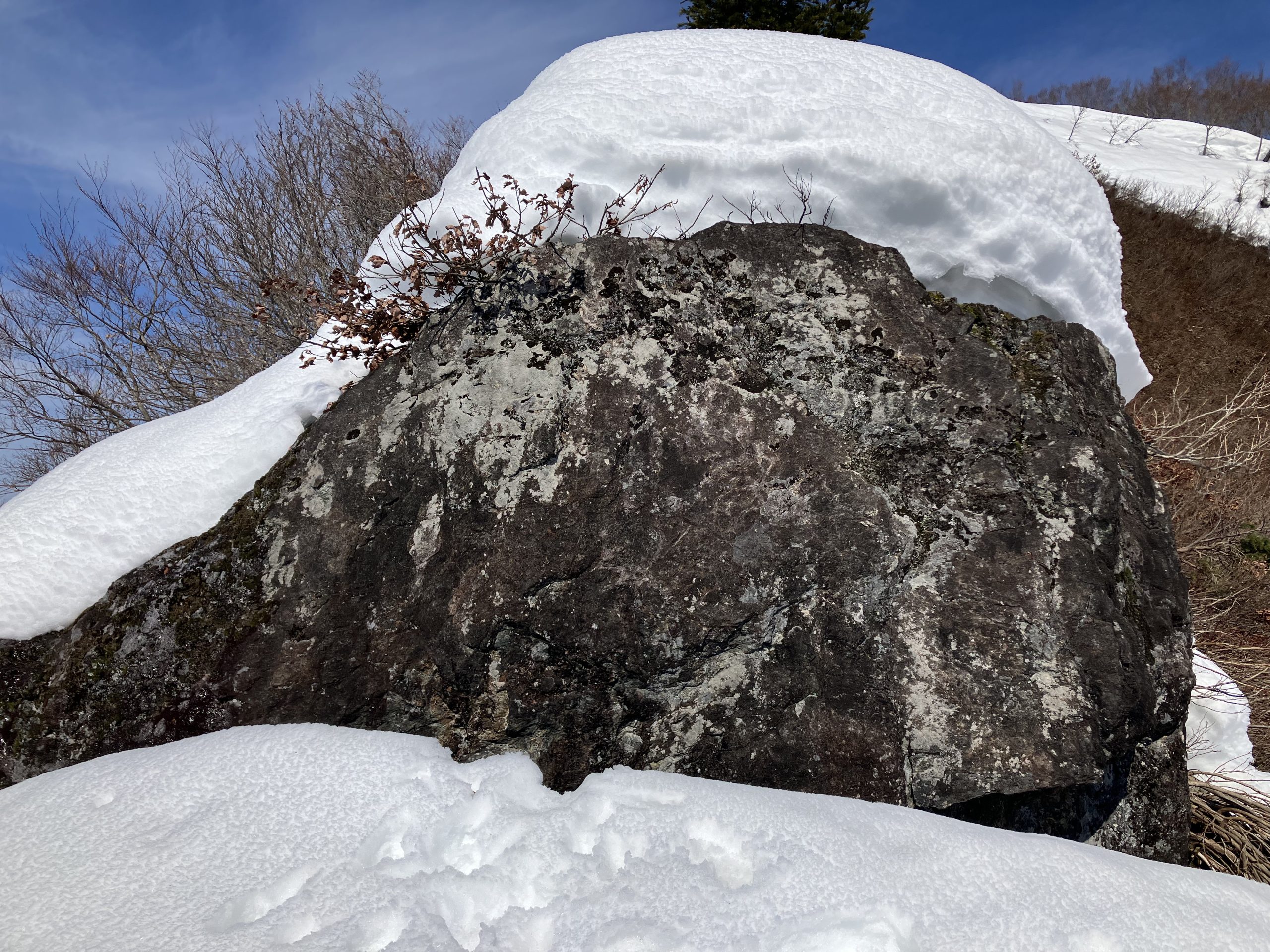 右巻きも崖で、左巻きも急なルンゼになっている。大岩の付け根は雪解けでシュルンドのようになっているが、どうにか積雪があるおかげで大岩によじ登れそうだ。まずさなしを抱えて大岩の上にあげ、続いて私もワカンを履いたまま上へあがる。