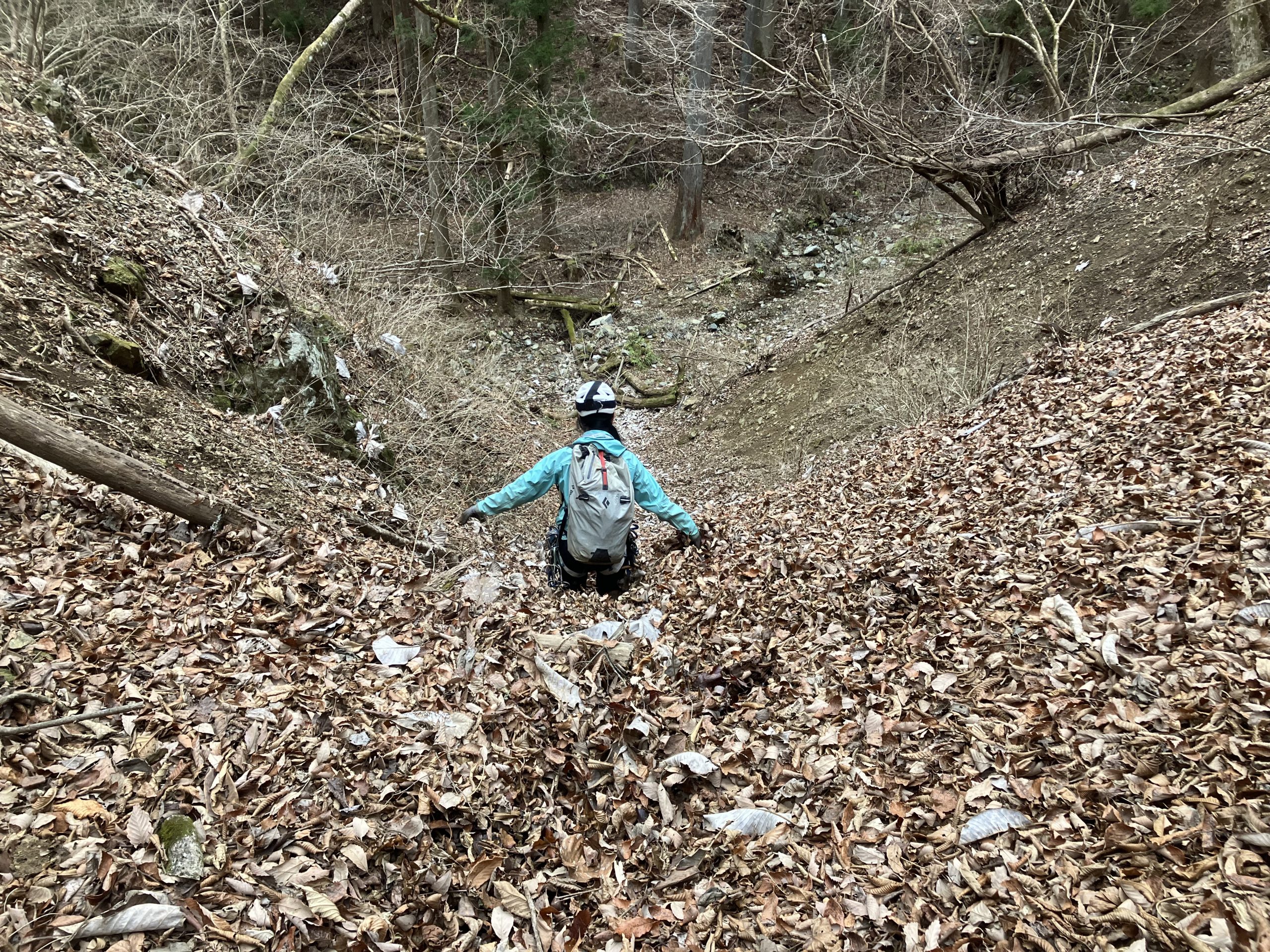 その後は特別難所はなく、次第に深い落ち葉ラッセルの詰めになったので、右岸の尾根を乗り越して左俣へ下降する。